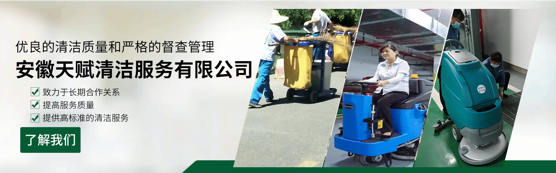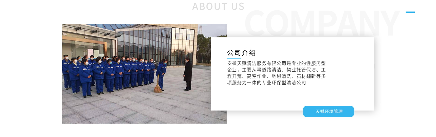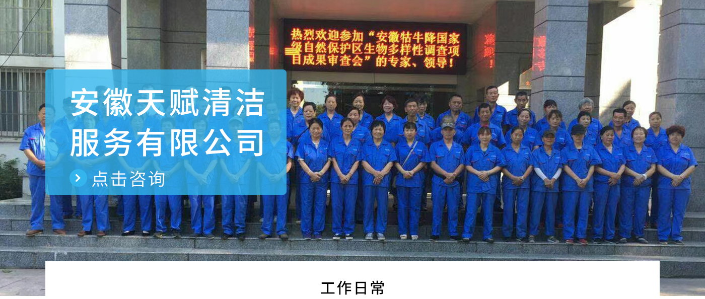 安徽天賦清潔服務(wù)有限公司是的服務(wù)型企業(yè),主要從事道路清潔、物業(yè)托管保潔、工程開荒、高空作業(yè)、地毯清洗、石材翻新等多項服務(wù)為一體的環(huán)保型清潔公司。公司管理機(jī)制完善,清潔作業(yè)經(jīng)驗(yàn)豐富,擁有技術(shù)力量,嚴(yán)格實(shí)行崗前培訓(xùn)—崗中督查—上崗在培訓(xùn)的員工管理措施,憑著優(yōu)良的清潔質(zhì)量和嚴(yán)格的督查管理,為眾多企事業(yè)單位、醫(yī)院、酒店、廠區(qū)商場、物業(yè)、道路、學(xué)校、公園等提供后勤清潔服務(wù)。在業(yè)內(nèi)擁有良好的口碑。工作人員,服務(wù)態(tài)度優(yōu),竭力為客戶提供好的保潔服務(wù)。安徽天賦清潔服務(wù)有限公司:致力于長期合作關(guān)系,提高服務(wù)質(zhì)量,提供高標(biāo)準(zhǔn)的清潔服務(wù)。公司的經(jīng)營理念:為營造一個更清潔、亮麗的生活和工作環(huán)境而努力!“誠信”是公司成功保證。“客戶至上,信譽(yù)為首”是公司宗旨。高標(biāo)準(zhǔn)提供服務(wù),維護(hù)客戶利益、形象,是我始終不渝的目標(biāo)。